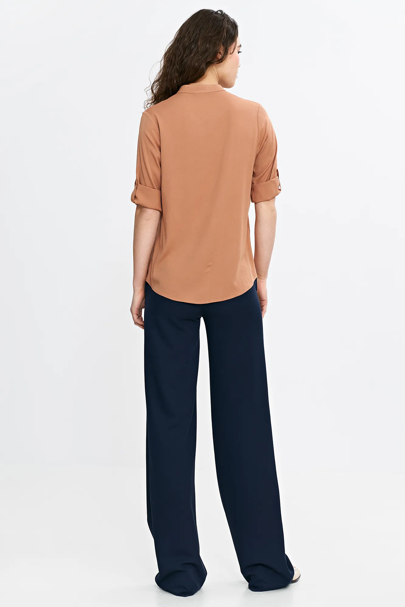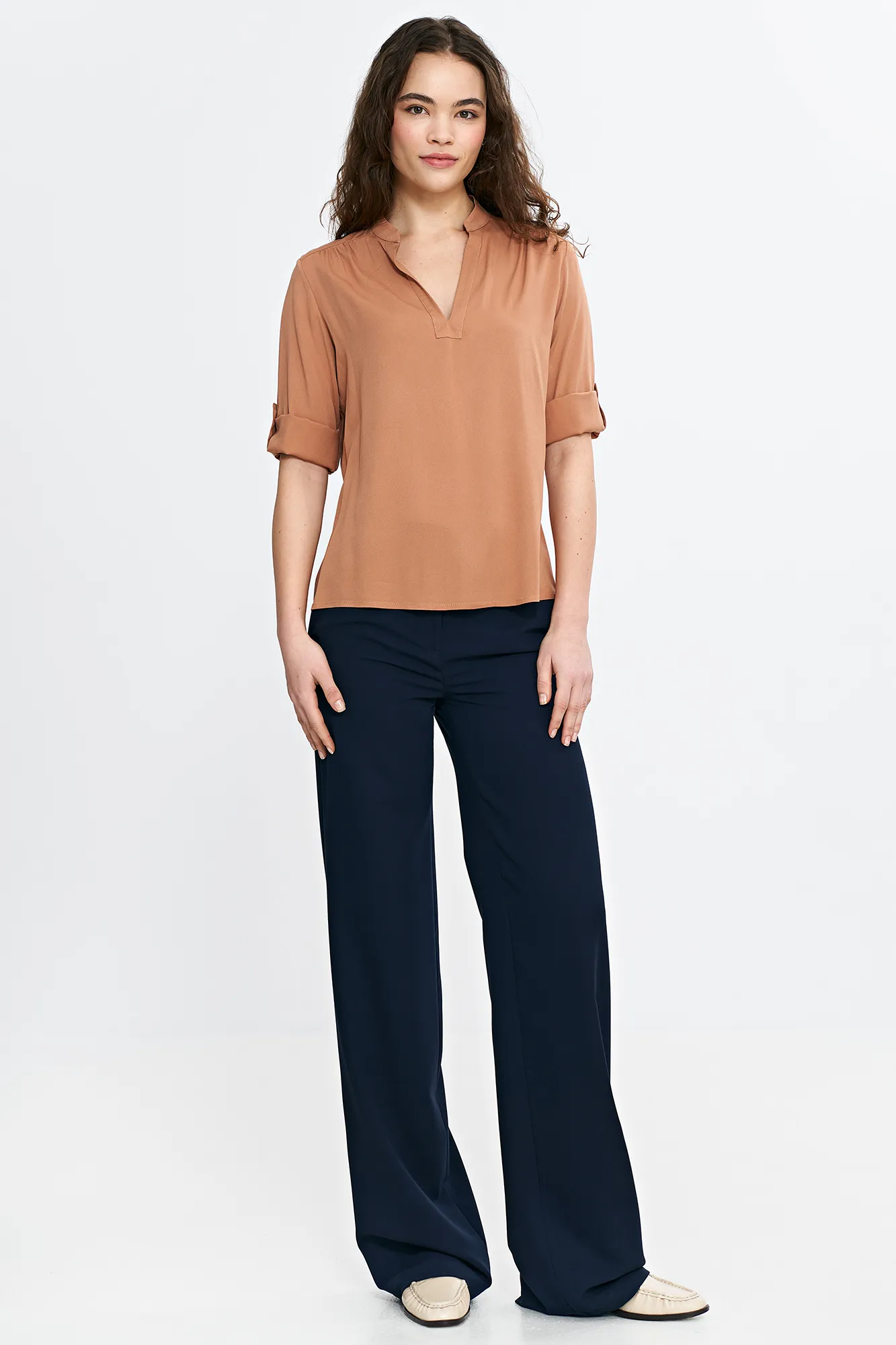 Regular cut. Viscose material. V-neckline. Sleeve with a tab for fastening. Rolled-up sleeve length- above the elbow. Pullover blouse. Gathered detail along the collarbone area.