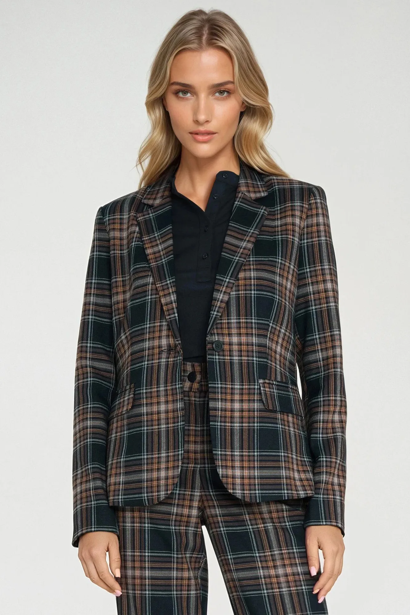 Fit cut, slim fit. Collar with classic lapels. Long sleeve. Shoulder pads. Hip-length. Single-button closure. Front flap pockets. Lined.