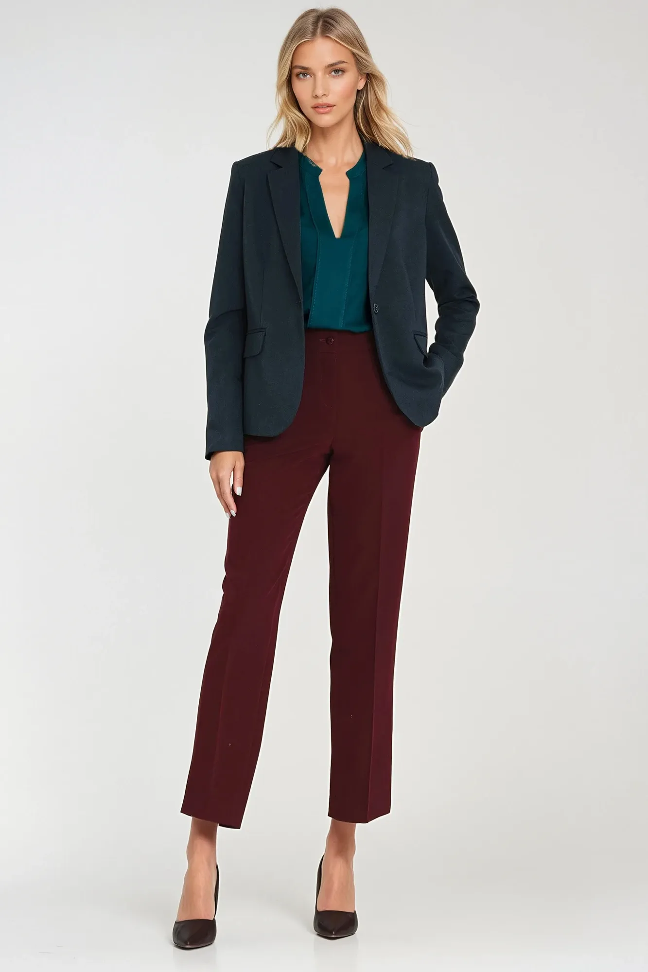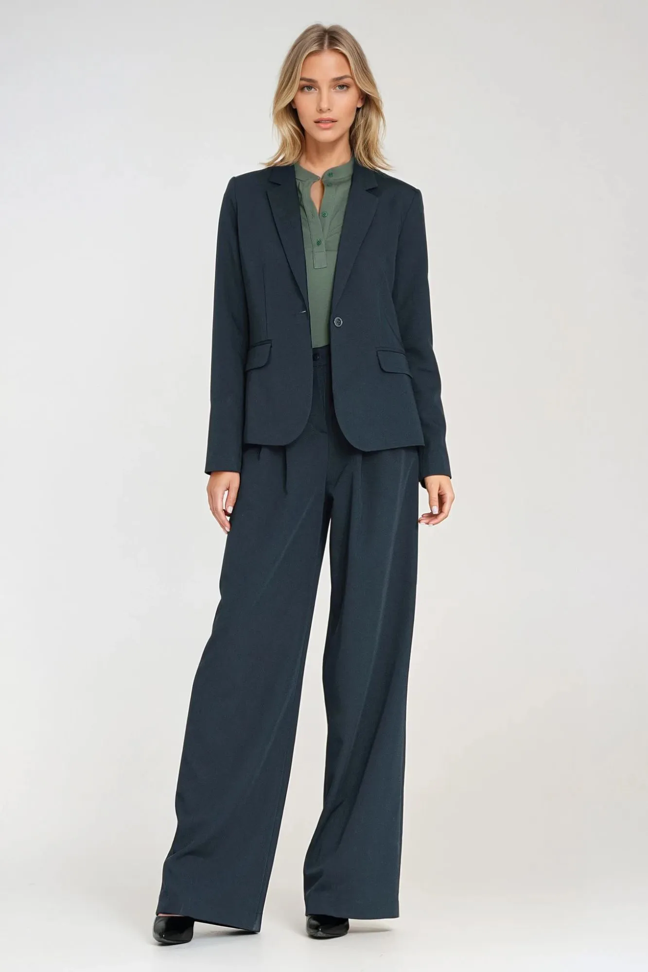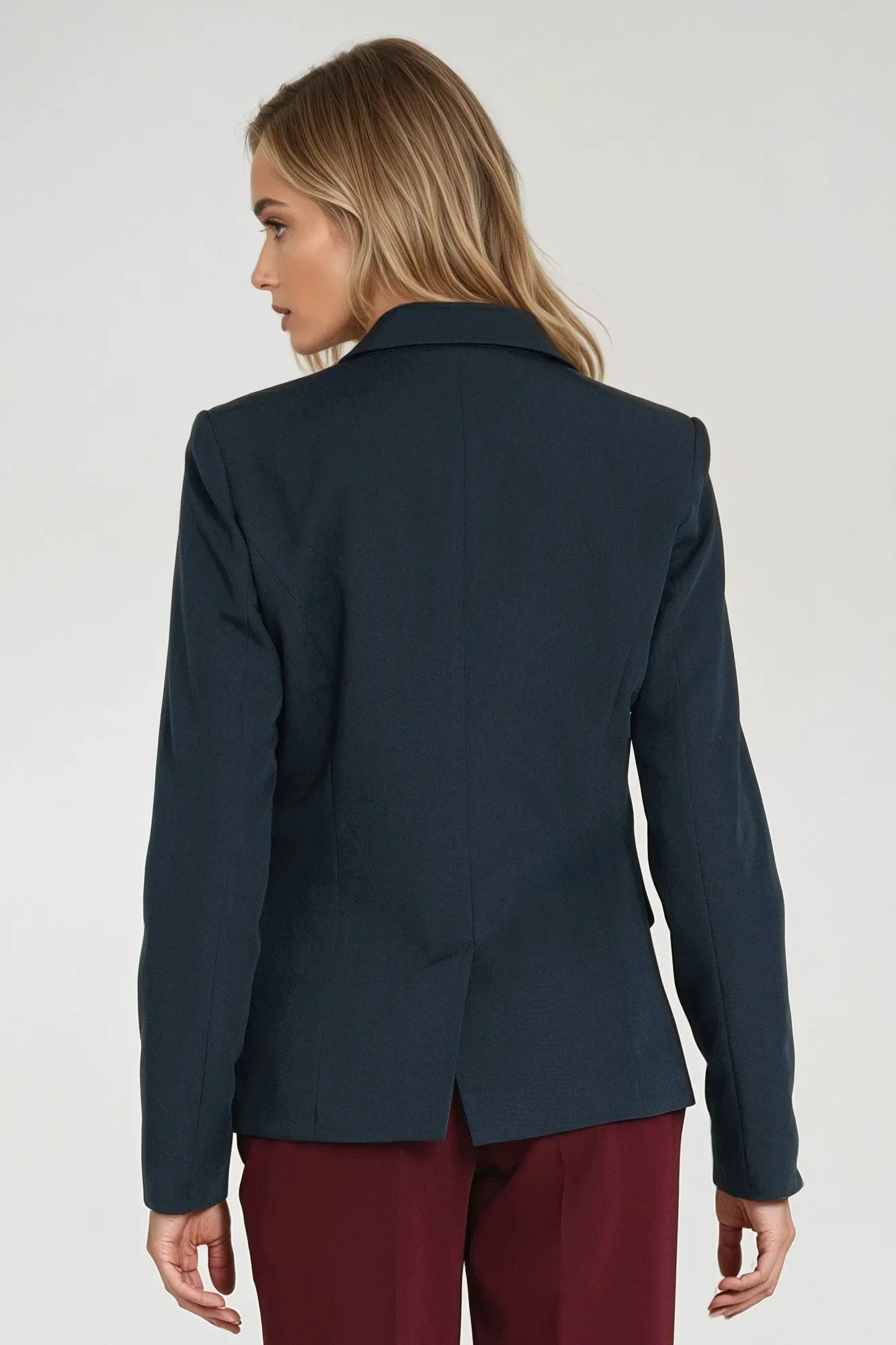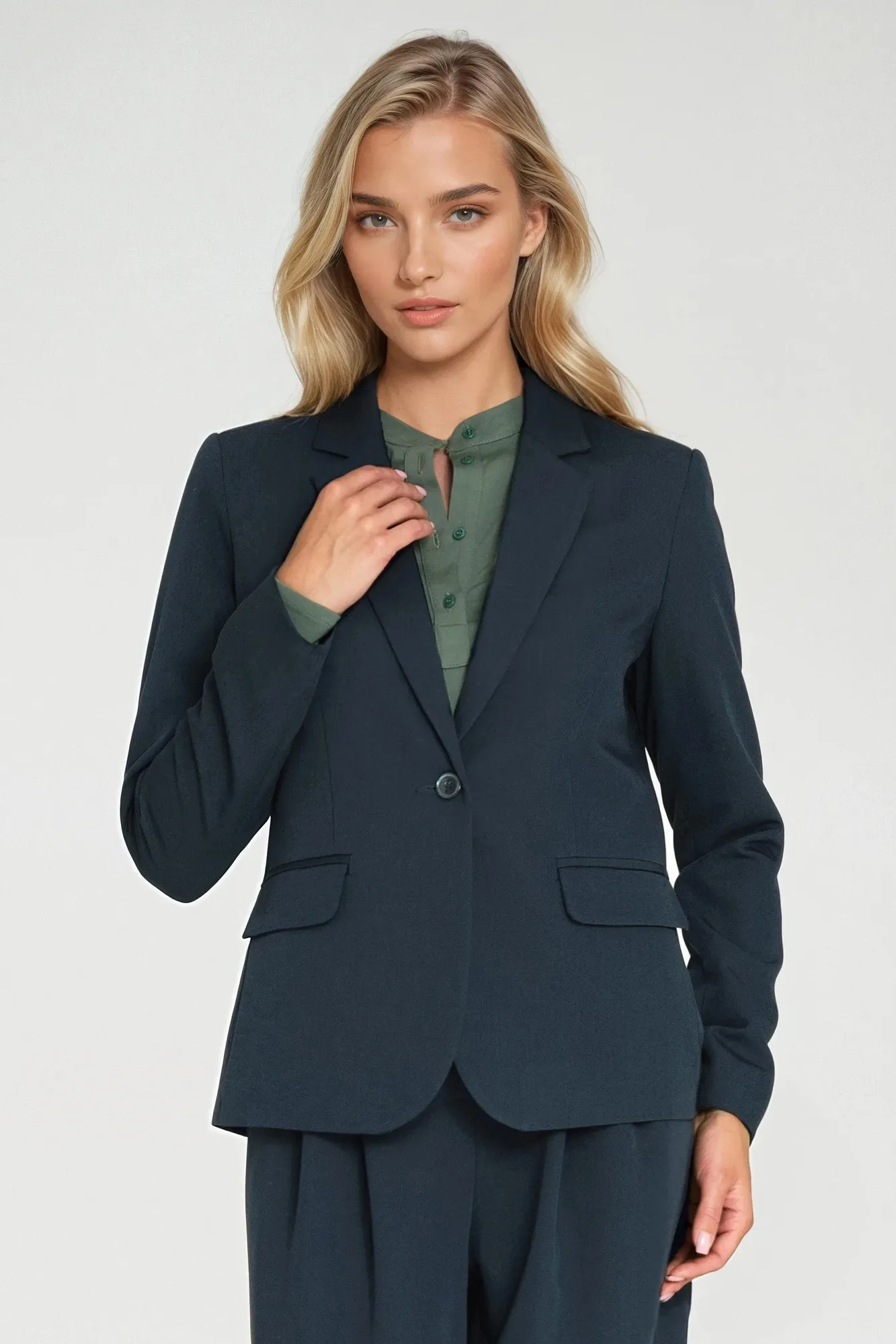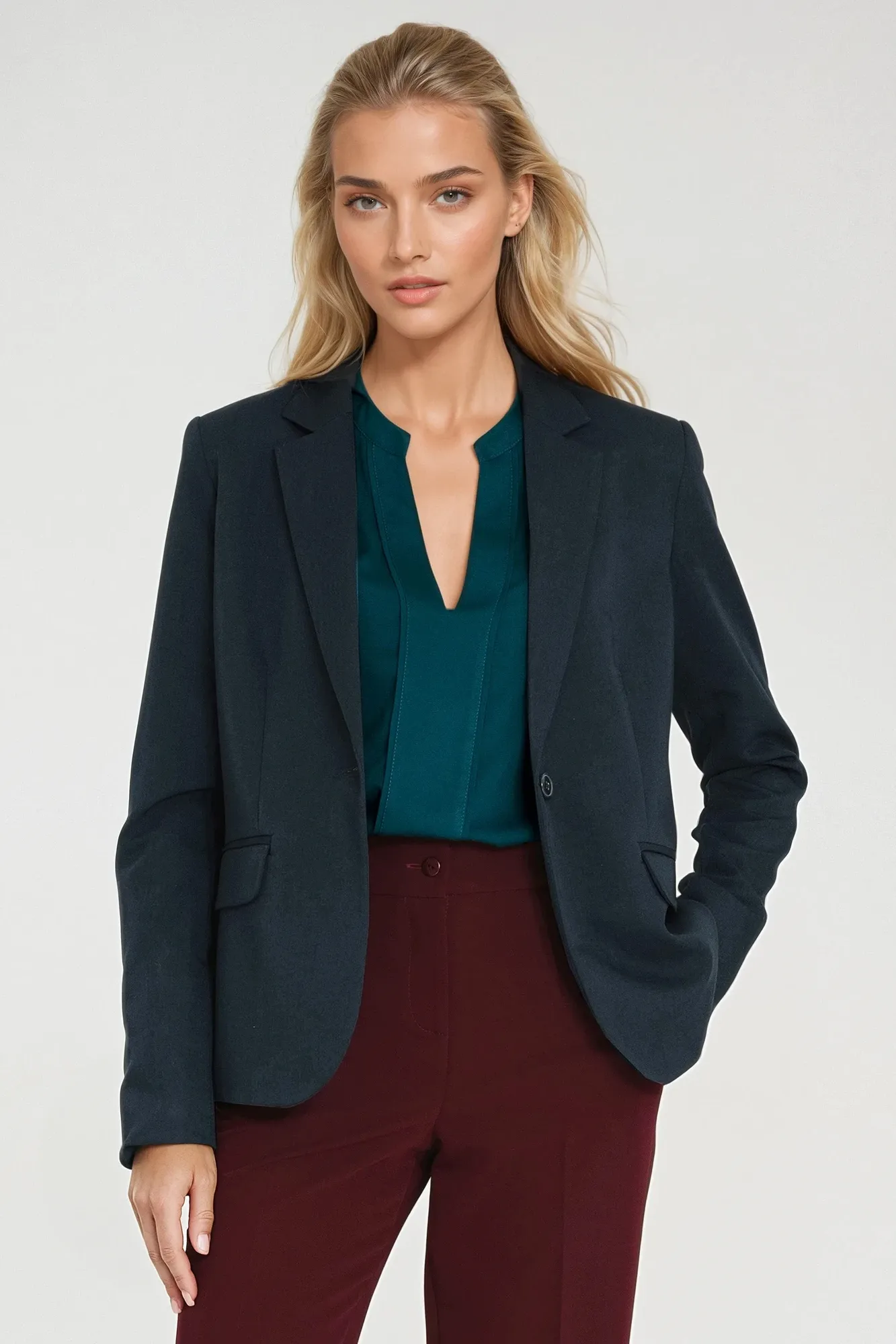 Fit cut, slim fit. Collar with classic lapels. Long sleeve. Shoulder pads. Hip-length. Single-button closure. Front flap pockets. Lined.