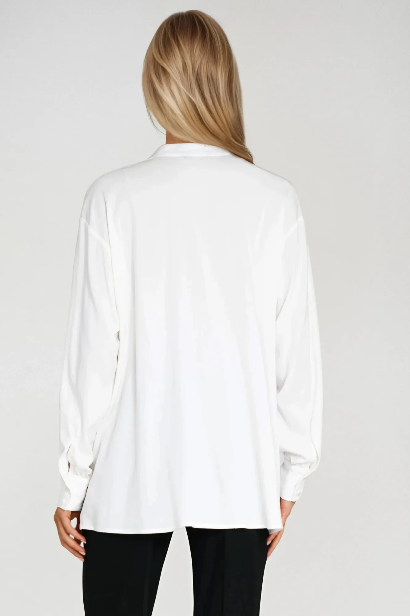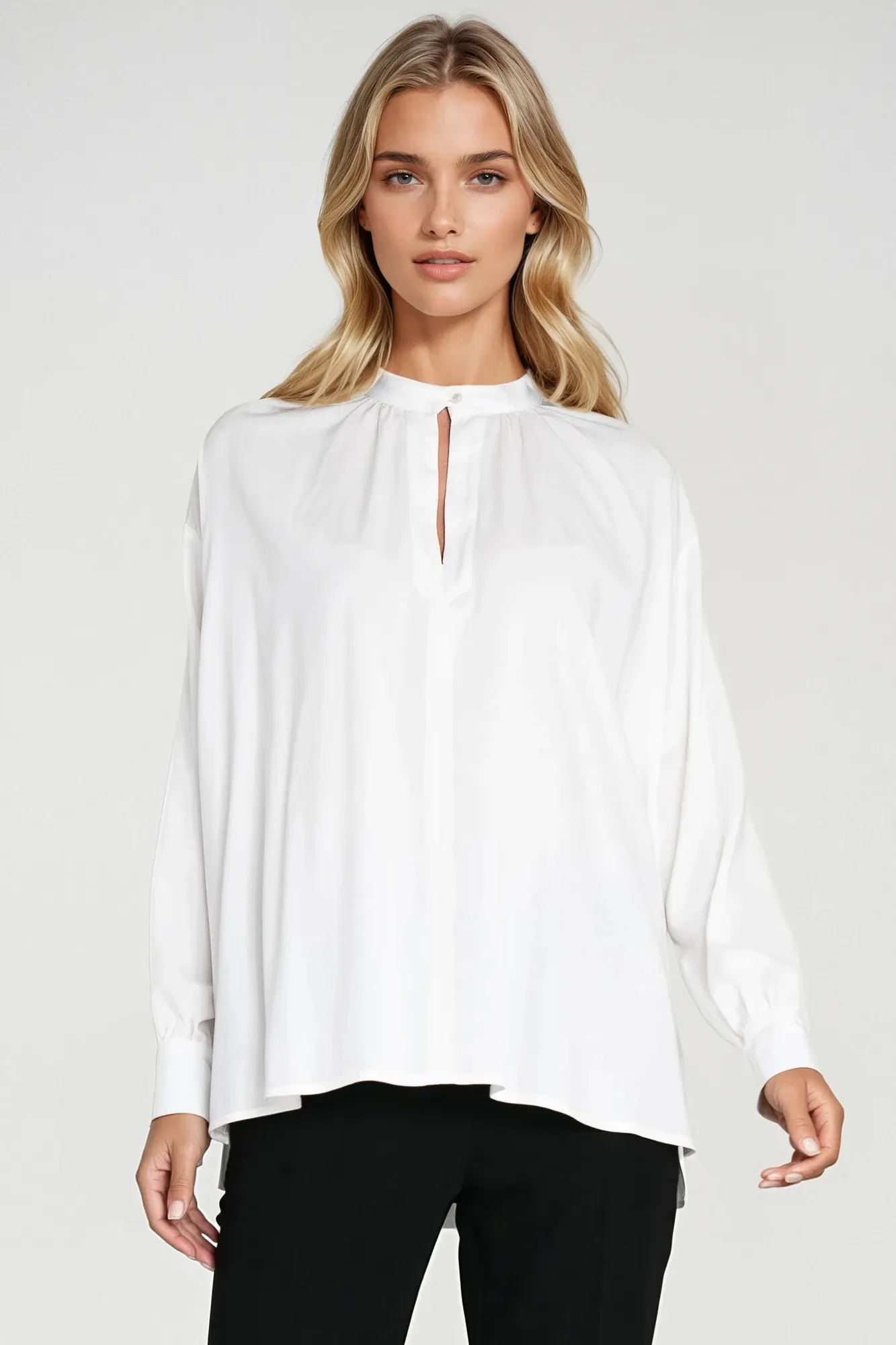 Oversize fit. Viscose fabric. Teardrop neckline with button. Long sleeve with cuff finish. Gathers at neckline and cuffs.