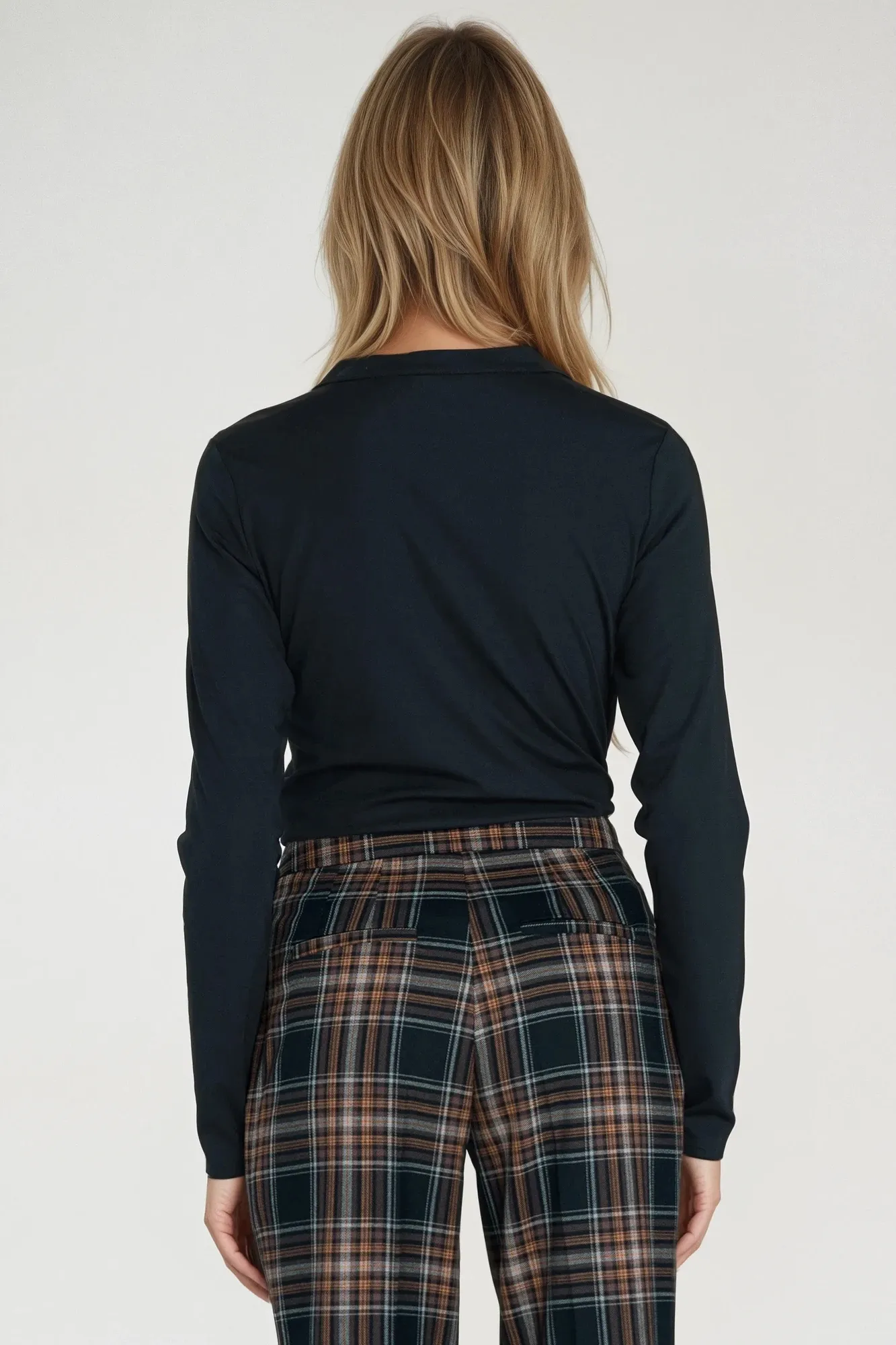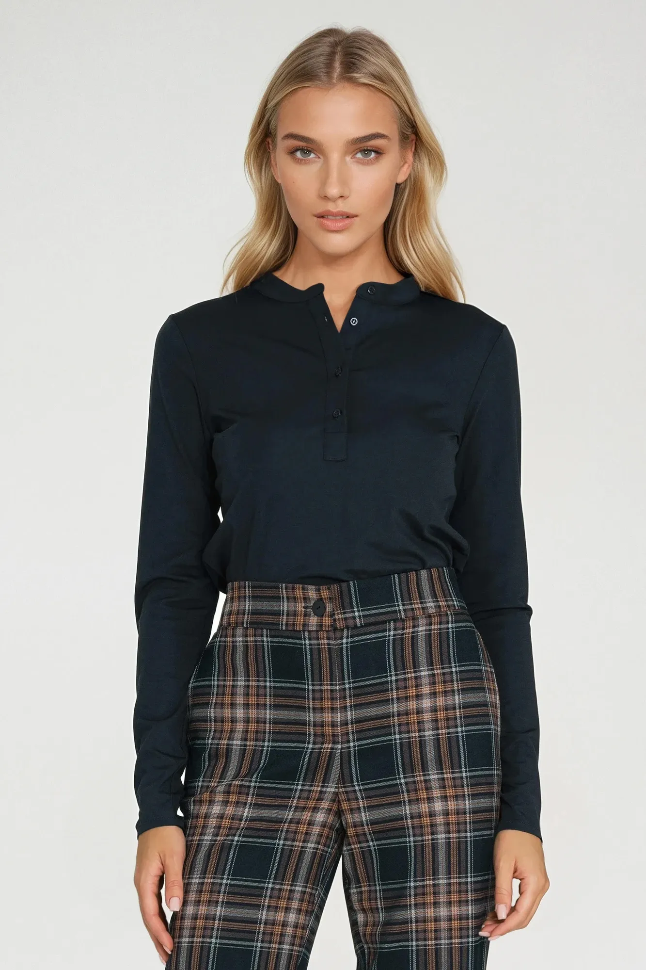 Fitted cut. Spandex fabric - stretchy. Polo neckline with stand-up collar. Long sleeve. Half-buttoned.