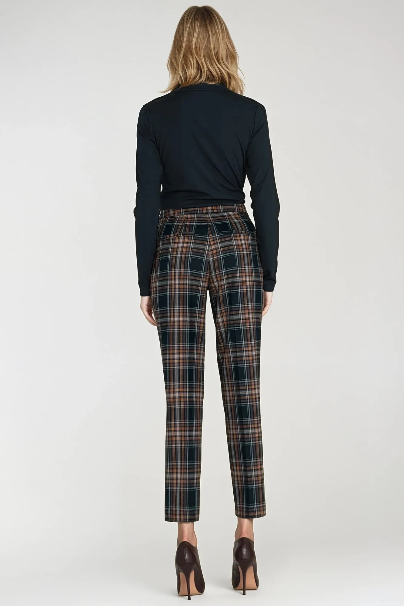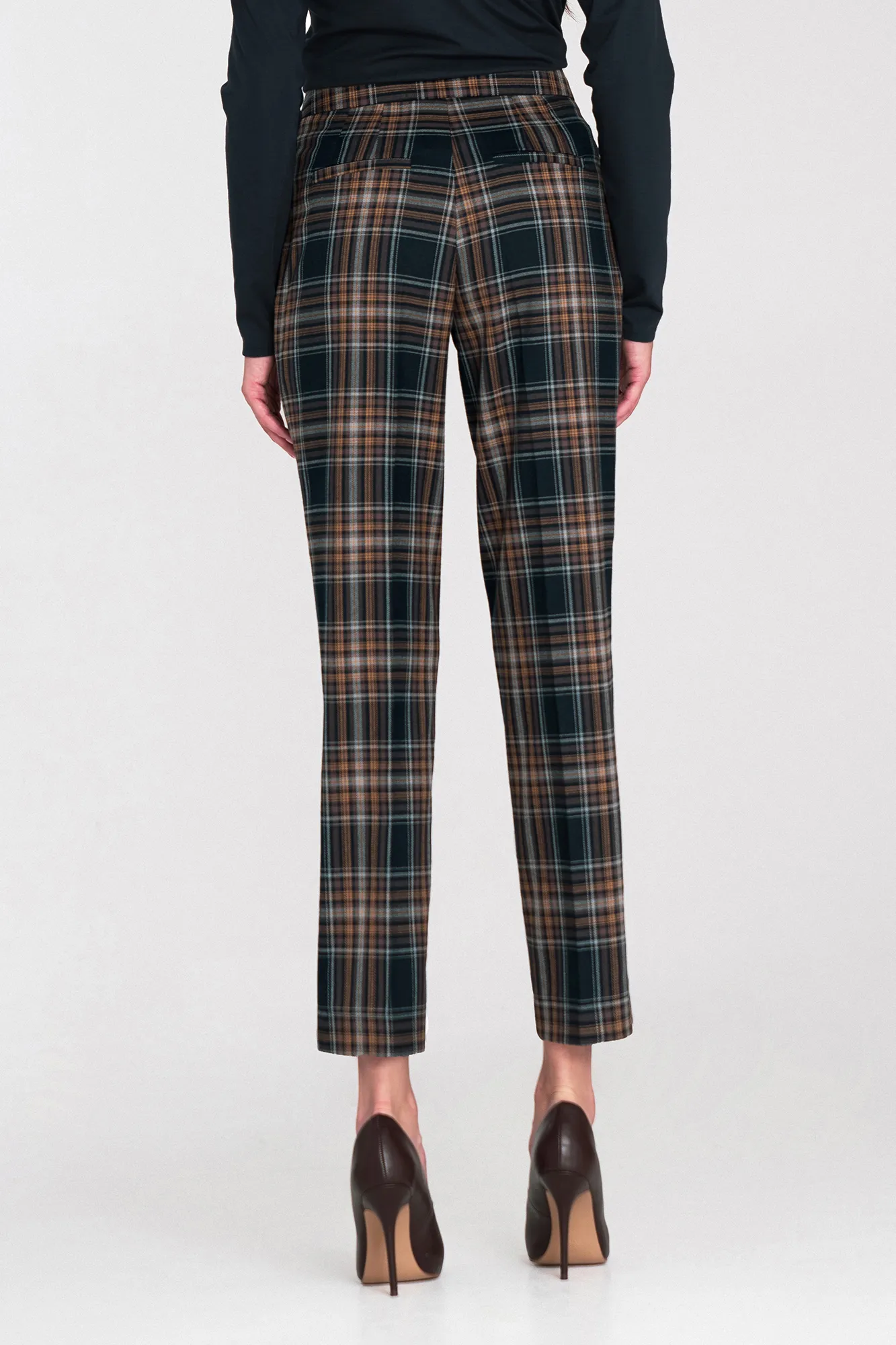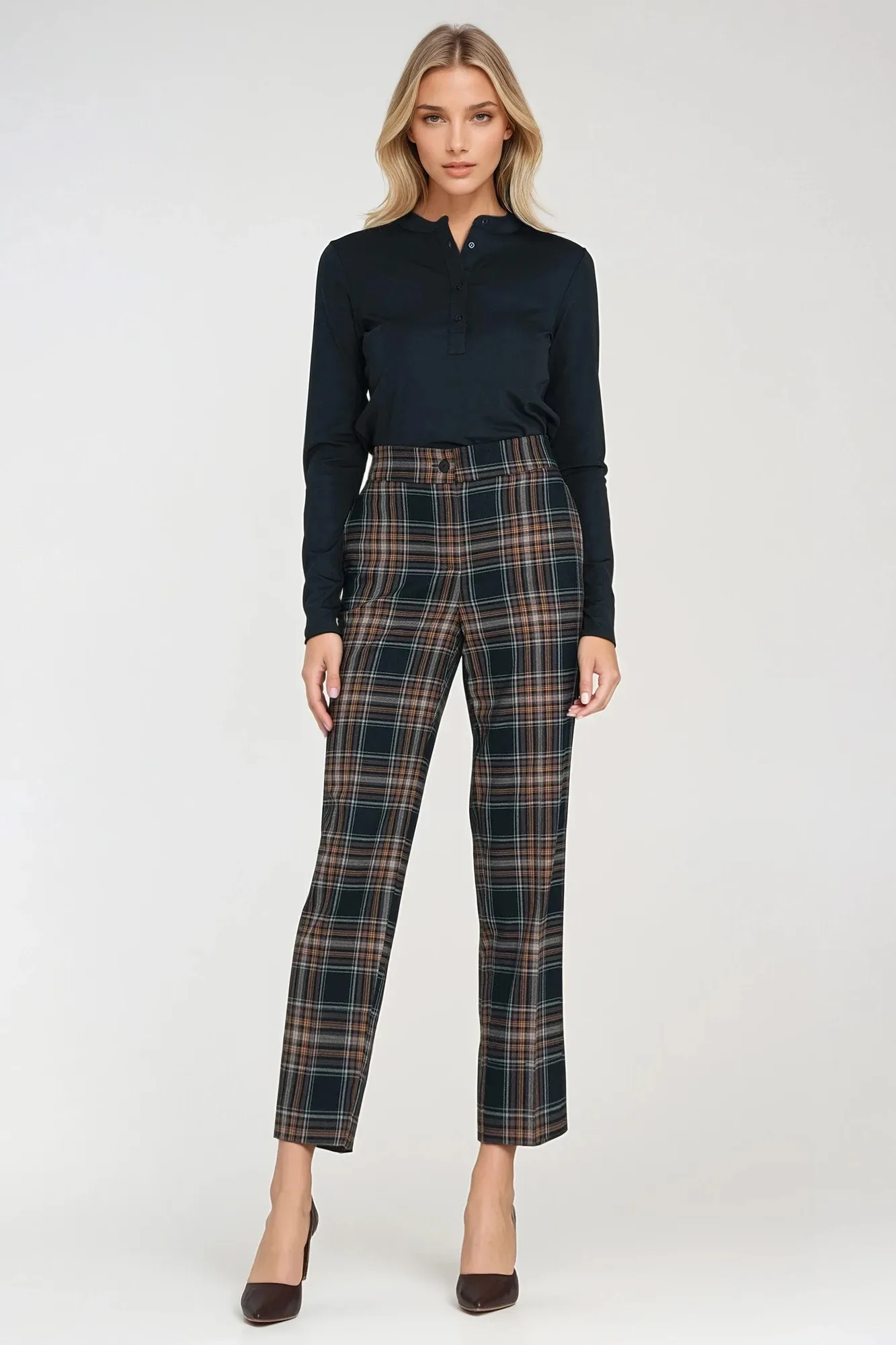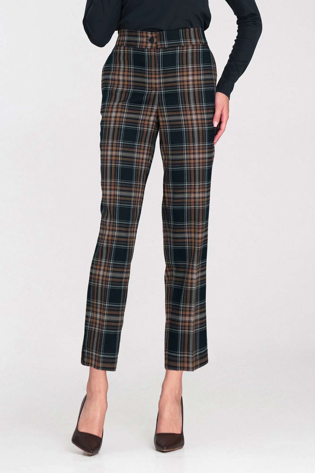Fit cut, slim fit. Mid rise. Tapered leg with small side slit at the bottom. Pressed creases front and back. Zip and one-button closure. Classic front pockets and imitation pockets at the back.