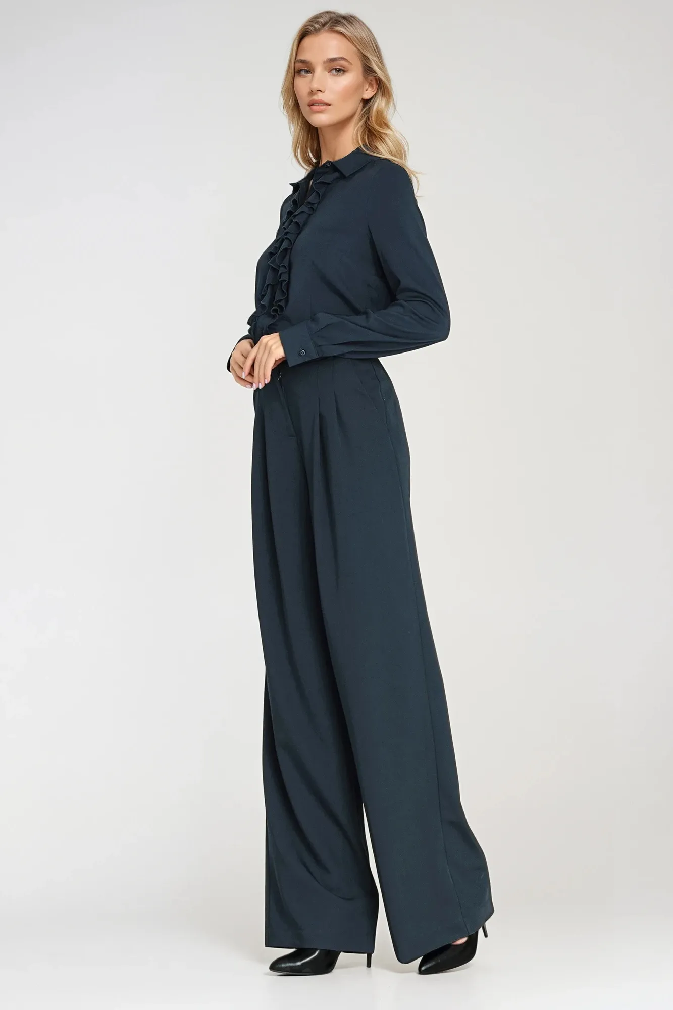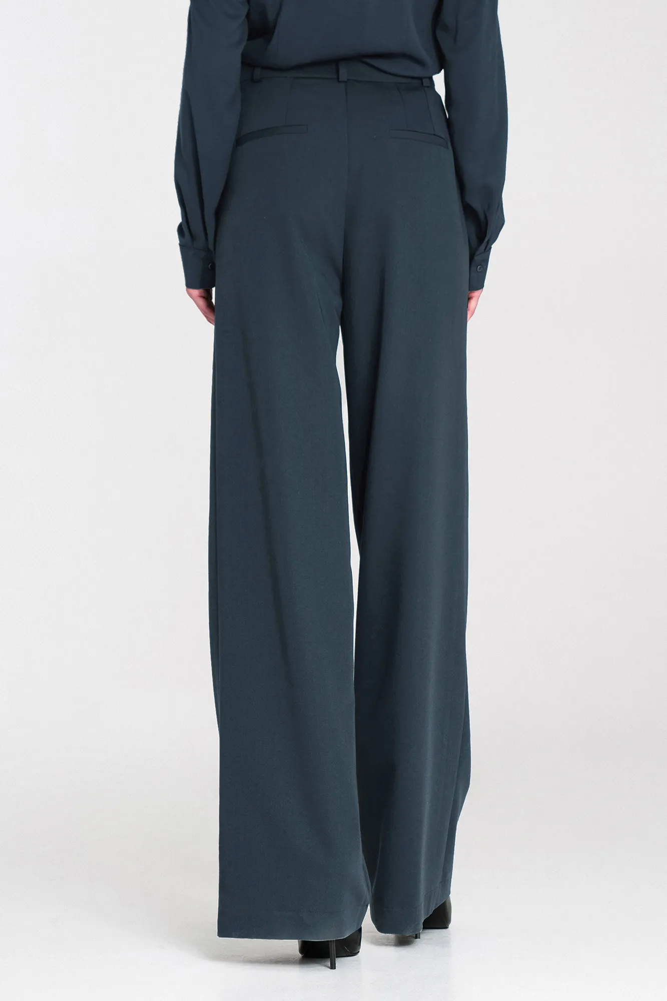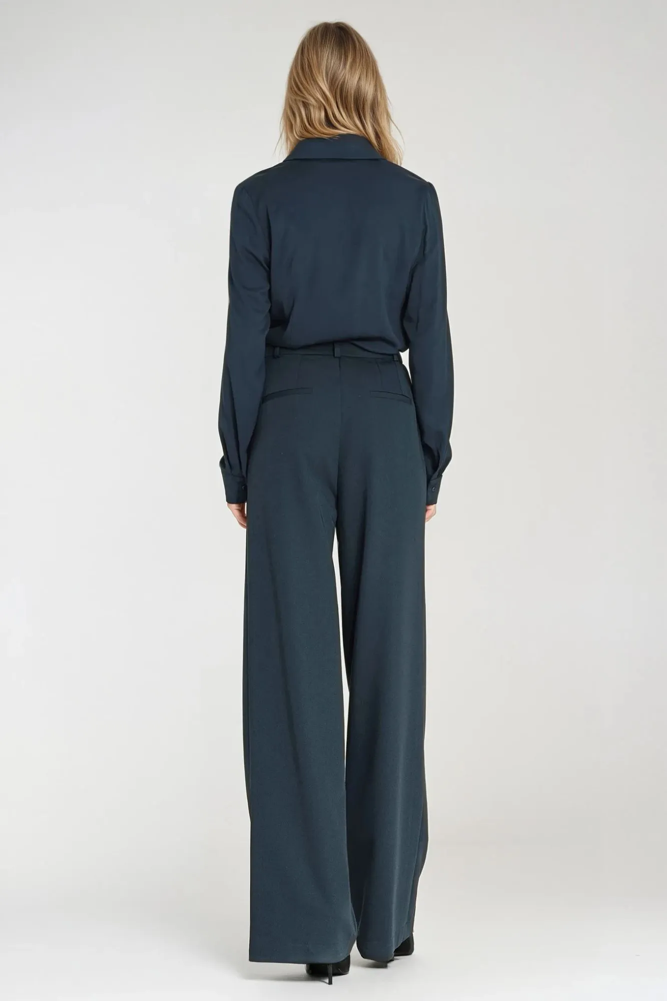 Relaxed fit. High rise. Decorative front pleats. Wide leg – long. Front zip and button closure. Classic front pockets and imitation back pockets. Belt loops.