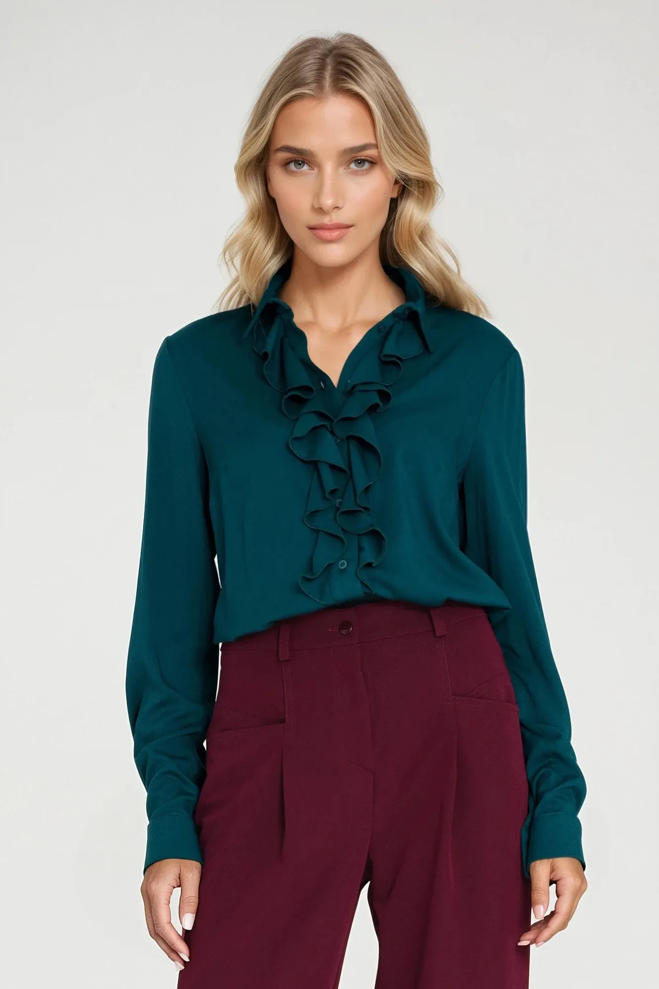 Fitted cut. Viscose fabric. Claccis collar. Long sleeve. Buttoned with decorative ruffle.