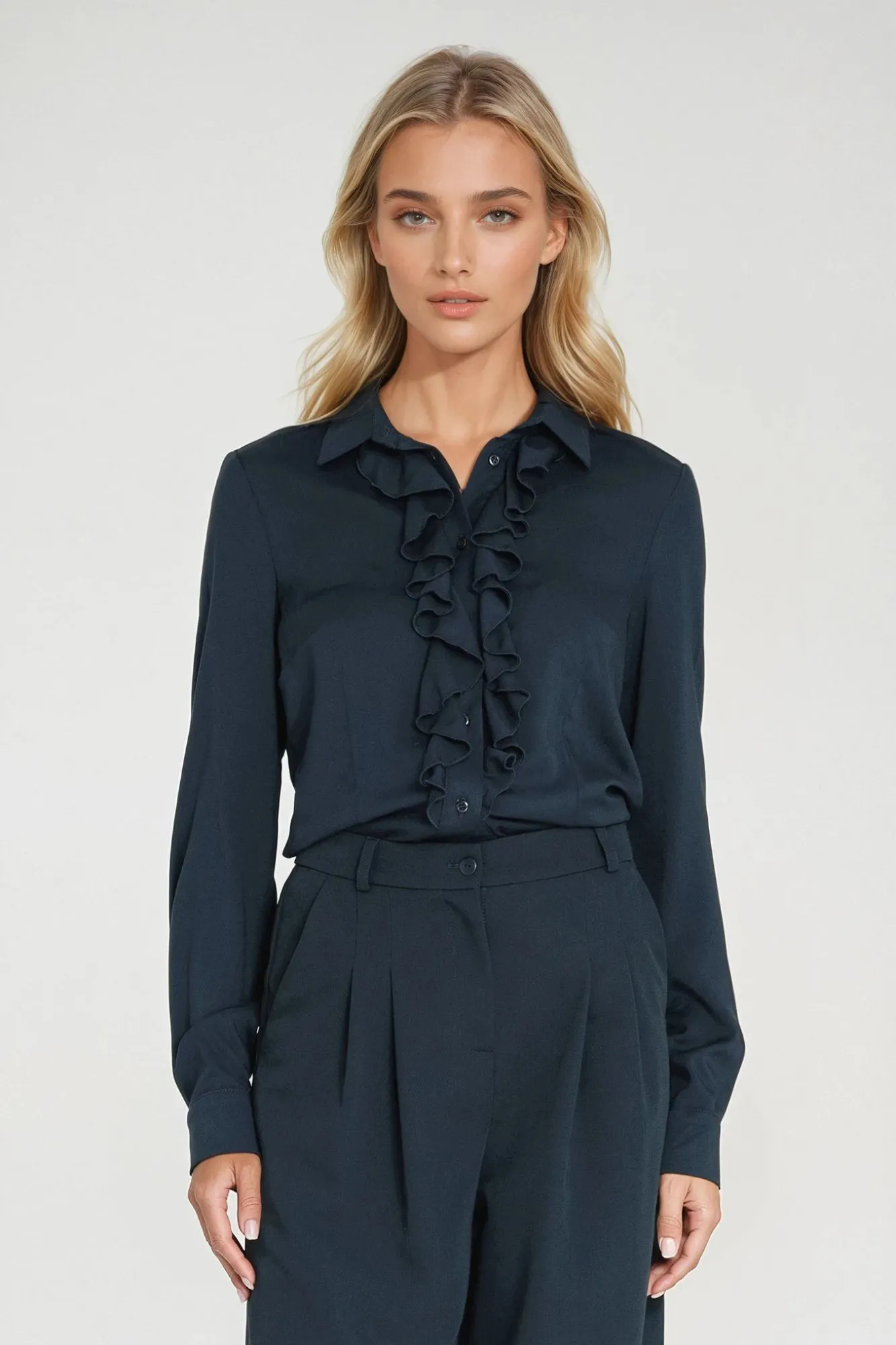 Fitted cut. Viscose fabric. Claccis collar. Long sleeve. Buttoned with decorative ruffle.