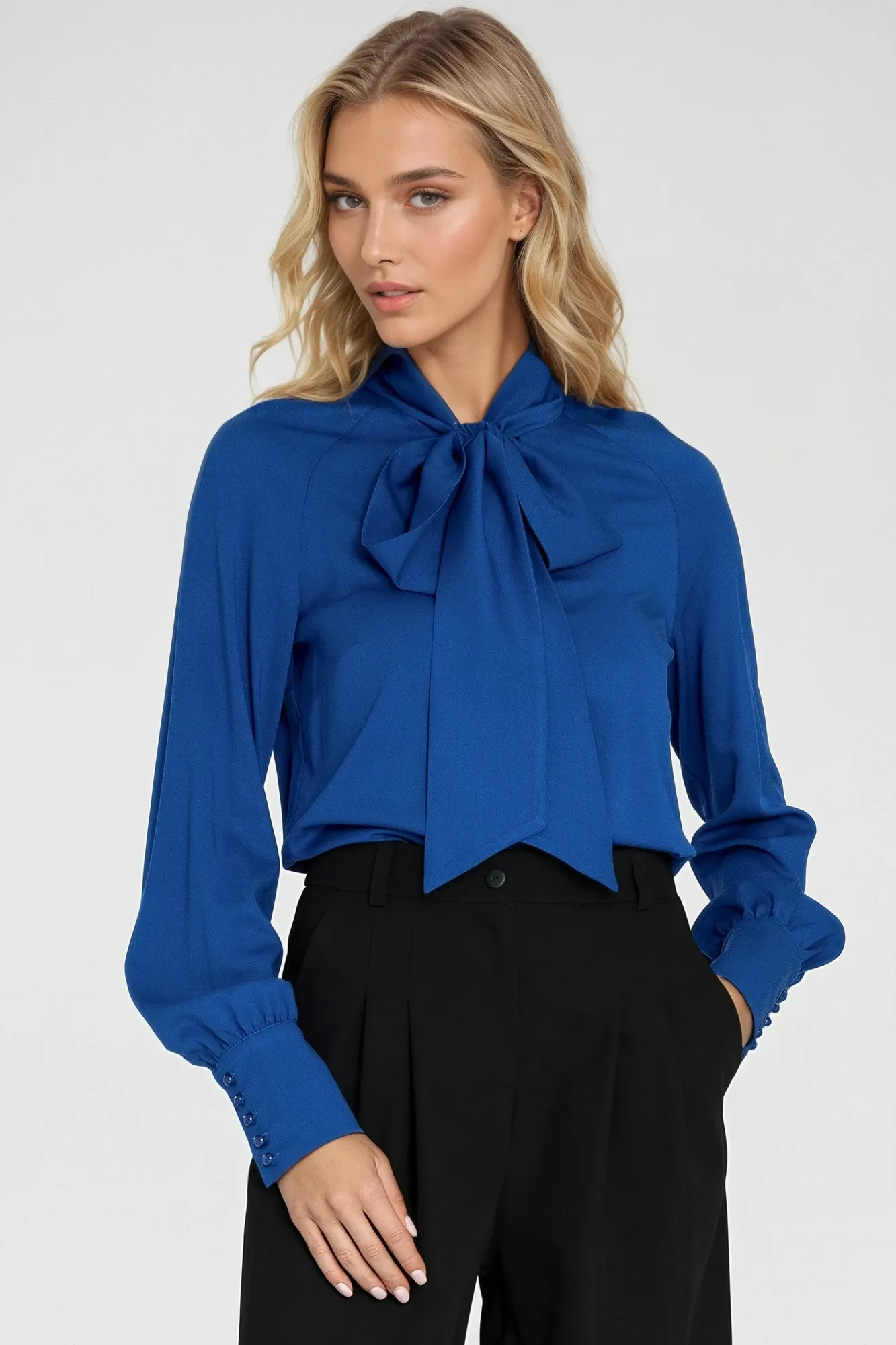 Regular fit. Viscose fabric. Tied at neck. Long sleeve with wide cuff and decorative buttons. Pullover style. Wide sash for tying.