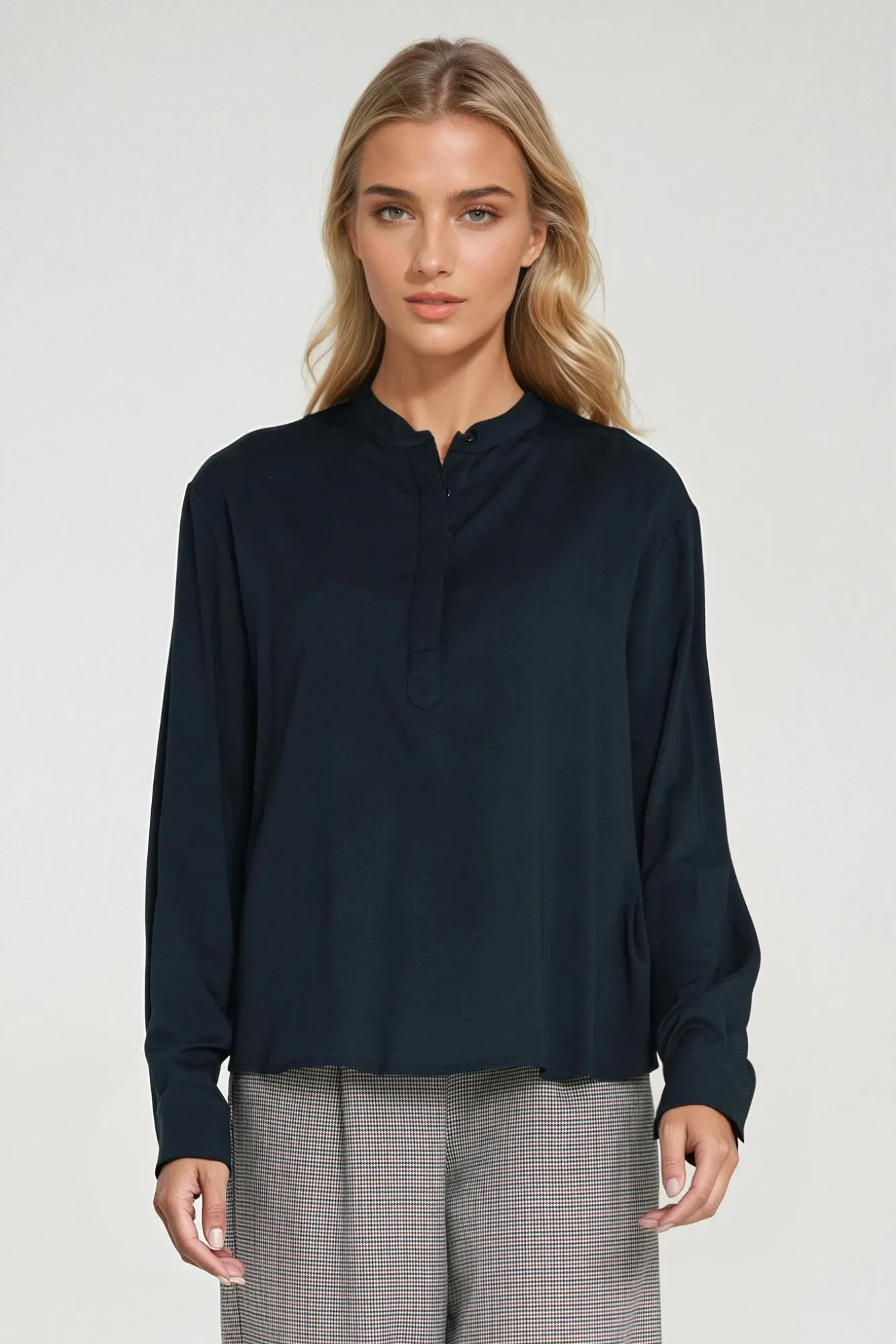 Oversize fit. Viscose fabric. Polo neckline with stand-up collar. Long sleeve with cuff. Half-buttoned with hidden placket.